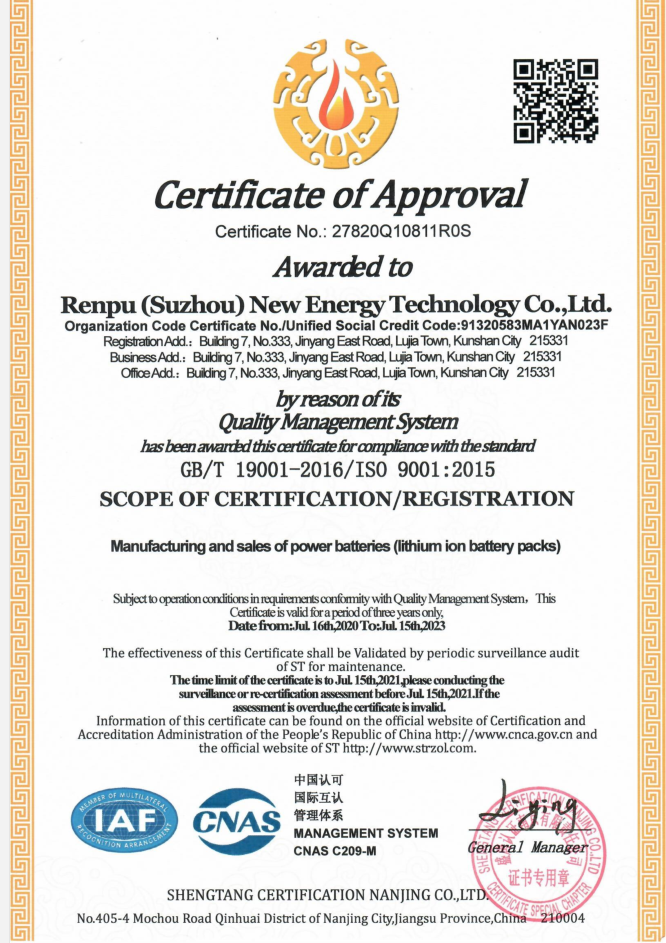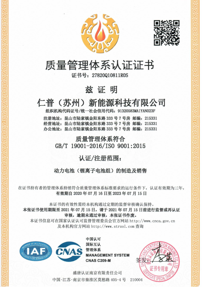 ISO9001认证-荣誉资质-仁普(苏州)新能源科技有限公司